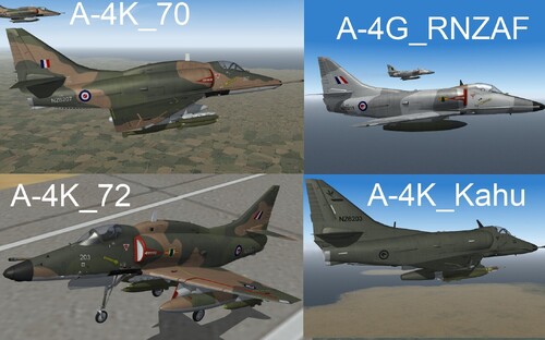 Thanks to alejandro all 3d models are now correct. Squared off tail fin, braking parachute, varies aerials and antenna unique to the New Zealand A-4K Skyhawks have now been added. Due to the way they have been created with the fake pilot method an overhaul was required. I have also re done the markings on all skins, things such as walkway lines, stencils, warning markings etc are now historically accurate. A few other minor faults have also been corrected.