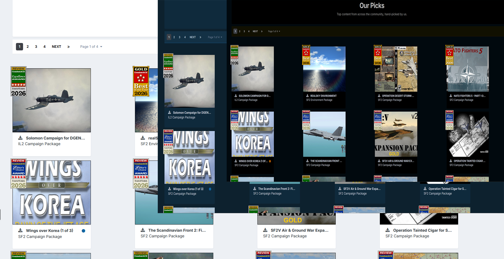 Erik Posted 13 hours ago Posted 13 hours ago Hi everyone, I'd like to take a minute to give everyone a quick update on our current projects. THEMES RELEASED We've released new themes for the site which change the look and feel of CombatACE. At the bottom of all our pages locate the Theme link and select it to choose your favorite look while using our site. The Wings Over Flanders Fields theme has been revamped and returned to the Old Brown Dog Software Forum. Our classic theme "Morning Light" is the professional white background in our traditional color set. The new theme "After Sunset" is a deep mid-range denim that reminds me of one of our first theme sets we started with back in 2002 called Bohegedda. The newest theme "Midnight Abyss" is a dark rich black inspired theme that is super easy on the eyes especially at night. Feel free to pick your favorite and let us know which one you like best. LIBRARY WORK The Admins and Modders have been hard at work restoring some lost images on older files. This has been something I've wanted to accomplish for years and just never had the time. I can't thank everyone enough for all their time and energy they've invested into this project. As we go through these files the system is updating the "last update" timestamp which is causing some issues with the way the library is displaying most recent files shown first. When we're done we'll be restoring all the timestamps which will return the files back to normal with all images restored. OUR PICKS We're working on a new roll-out of hand-picked files we're endorsing as must-have downloads. We're continuing work on the section and hopefully will be done with it soon. Give it a look and let us know what you think of it so far. The Our Picks section of the site is live here https://combatace.com/ourpicks/ 7 6